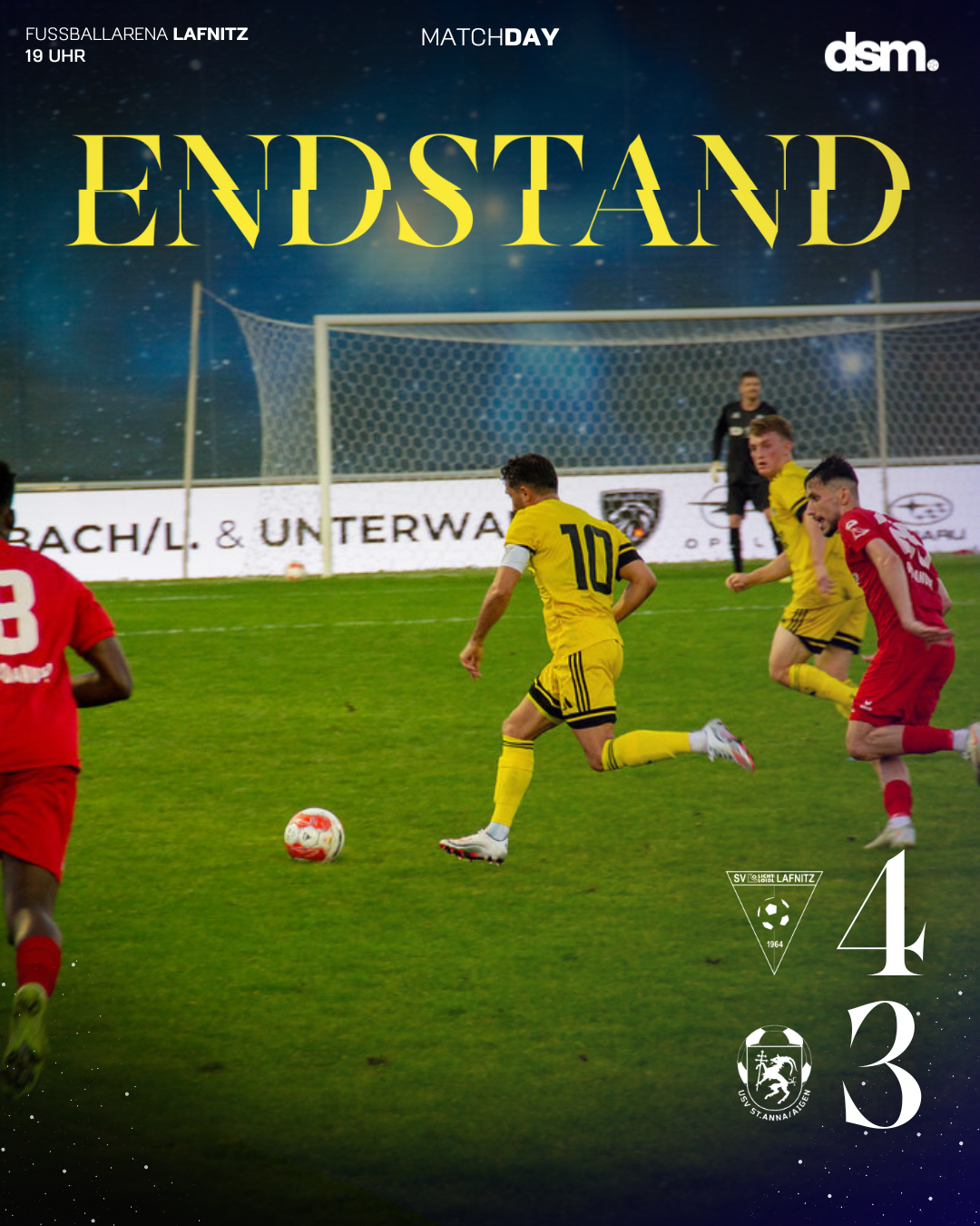 Was für ein Fußballabend in der Lafnitz Arena! In einem torreichen und mitreißenden Spiel zeigte unsere Mannschaft große Moral und drehte eine bereits verloren geglaubte Partie. Trotz eines frühen 0:2-Rückstands feierten wir am Ende einen verdienten 4:3-Heimsieg gegen den USV St. Anna/Aigen und sicherten uns damit wichtige Punkte in der Regionalliga Mitte.